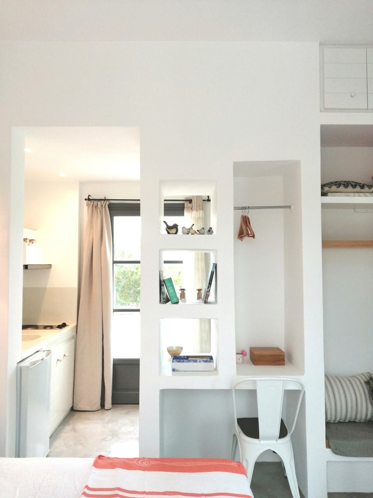 Anemosyrma is a traditional beach house in the magnificent island of Milos. Located in the small picturesque village of Agios Konstantinos, Anemosyrma (“anemos” greek word for wind & “syrma” for Melian boat house) is actually the upper floor of a traditional “syrma”, where people used to drag and store their boats to be protected from the sea. The apartment of 50m2 in an open space plan, has a balcony overlooking the sea and it preserves a modern country style featuring unique Cycladic elements.