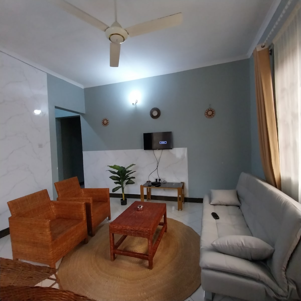 Comfort and Peace: In Mwenge mpakani, Dar es Salaam, we offer a two-bedroom house with a modern design. This house has a beautiful view of the city, a beautiful garden, and modern amenities such as fast WiFi, a modern TV, and a kitchen with modern appliances. There is also an entertainment area and adequate security. Welcome to live with us!