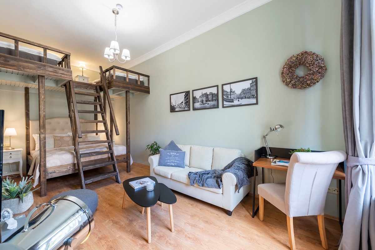 Wake up in a bright boutique style apartment with premium touches and high ceilings in a historical building. Choose to freshen up in the walk-in shower of a spacious bathroom or make smoothie in the compact kitchen. Head to the bakery downstairs for some freshly baked treats before taking a riverside stroll and hitting the exciting spots in the city.