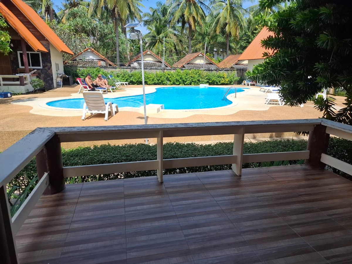 Quiet and peaceful private AC room with king-size bed, private bathroom, and tranquil garden view. private bathroom with hot water shower, a porch with a fan a garden and jungle view, outdoor seating, TV, kettle for tea/coffee, mini bar for a fee. Featuring the only fully stocked bar in central Koh Lanta and a lunch/dinner cafe. Our location is <1 KM from Lanta Elephant Sanctuary and the Mai Kaew Adventure Cave, 2 km to Klong Nin Beach.