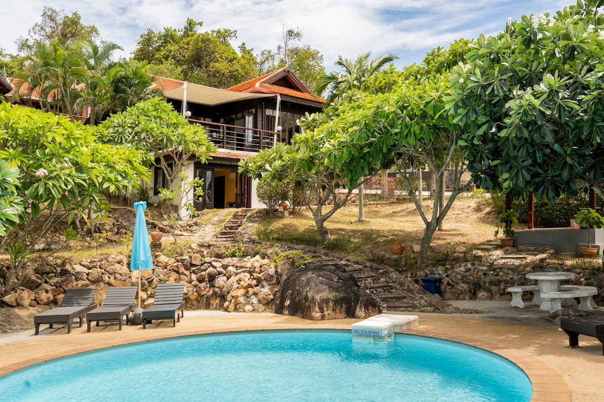 101 5*Reviews, Beach Villa with brand new pool with water fall and jacuzzi jets in the stairs. Escape the hustle and bustle of everyday life and treat yourself to a getaway! Enjoy views of Bang Por Beach from your porch with an amazing pool view. Plenty of Shopping and restaurants. 15 minutes to Nathon and 30 minutes to the airport. Also your own “Thai Mama" that brings amazing Thai food right to your table. Free Wifi, Netflix and SUP & Kayak and now a pool.