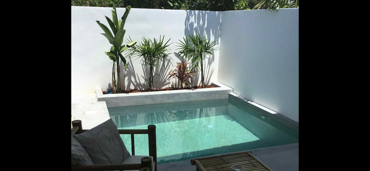 Welcome to a peaceful designer studio tucked away in lush greenery, yet just minutes from beaches, cafes, and shops. Enjoy cool breezes on your private garden patio, watch favorite movie on 3 seat sofa, rest on a comfy queen-size bed in dedicated sleeping zone, and refresh in the modern bathroom with hot shower. Stay connected with lightning-fast Wi-Fi (1000/500 - Mbps), relax with A/C, and feel secure with gated access, CCTV, and insulated double walls. Please note: no pool access..