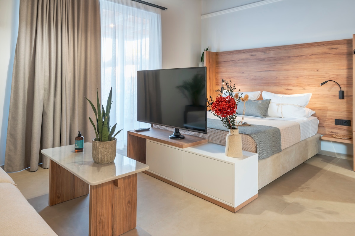 Welcome to Mare at Mia Anasa - Luxury Suites! An exclusive retreat offering unparalleled luxury. Immerse yourself in the private Jacuzzi on the balcony as you soak up panoramic views of Telendos Island and the glistening Aegean Sea. This chic apartment is the perfect romantic holiday getaway, featuring a cozy bedroom, a stylish bathroom, and a fully equipped kitchen. Step onto the balcony to savor your morning coffee on sun loungers with breathtaking vistas stretching before you.