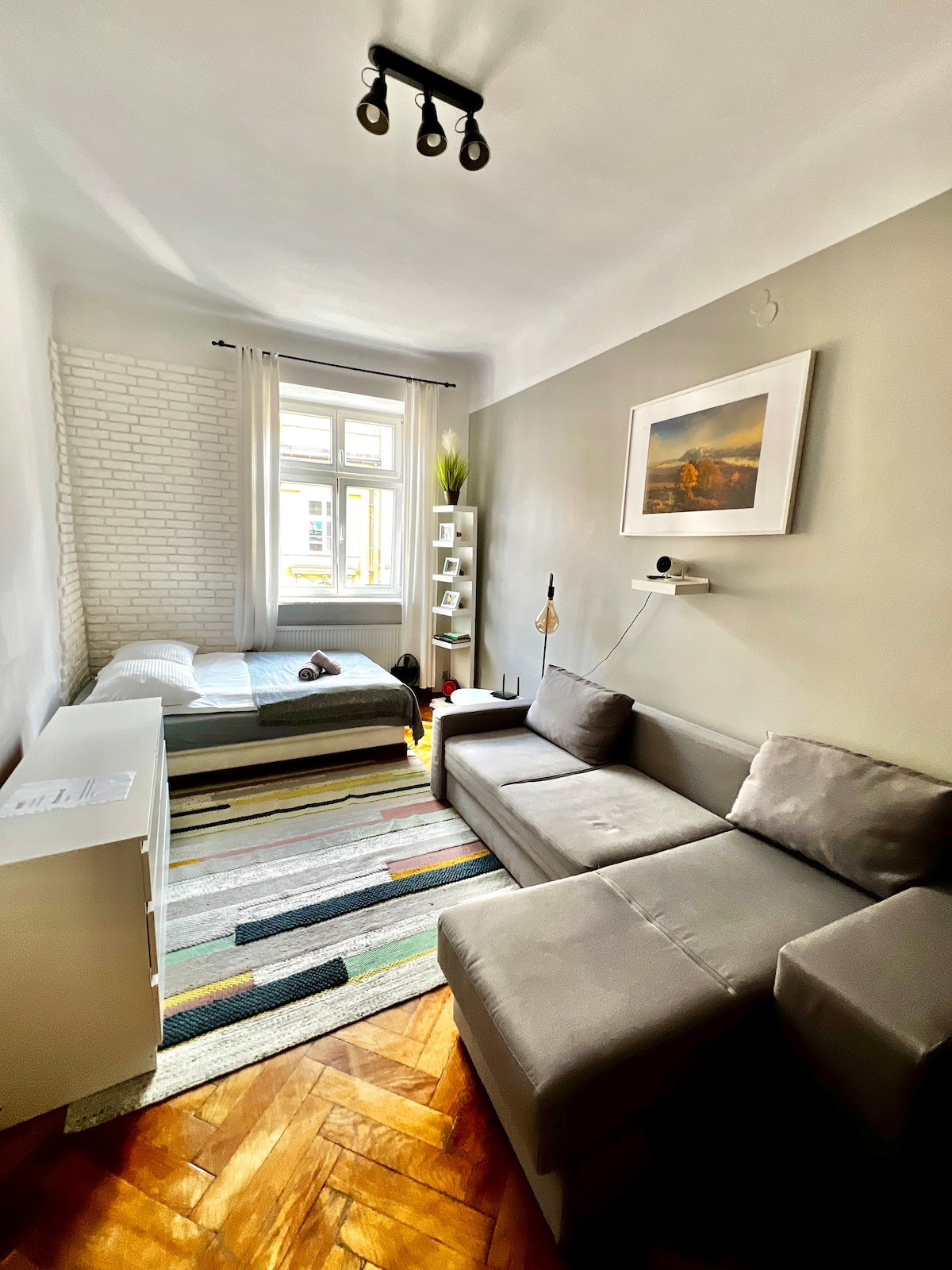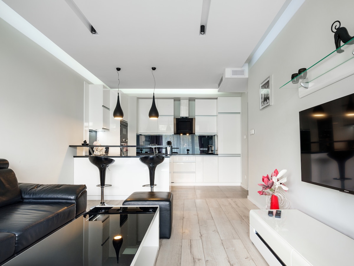 Beautiful, completely renovated, spacious apartment (50 m2) in the heart of the city. Apartment is located 3 min walking from the main train and bus station and in front of the biggest shopping mall Galeria Krakowska. However the windows are facing beautiful park (Strzeleciki) which makes it amazing feeling being outside of town with all the tress around it. Kitchen has all new appliances with over, stove, dishwasher and build in Coffee maker Bosh! Place has a unique design