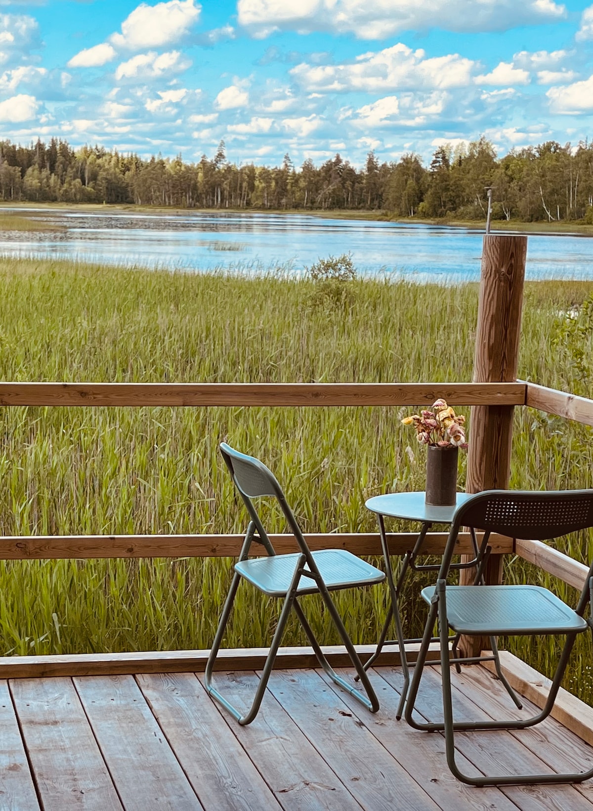 Njut av naturens ljud när du bor på detta unika ställe. Djur- och fågelliv är rikt och på sjön växer det näckrosor. Inget annat finns runt sjön så ni är helt ensamma här. Stolphuset ligger på en platå 2 meter upp i luften så den erbjuder fin utsikt över sjön. Det är trätrall runtom huset som erbjuder sittplatser i olika sollägen samt ett utekök där det finns stormkök för enklare tillagning av mat. Vid sidan om finns ett litet utedass.