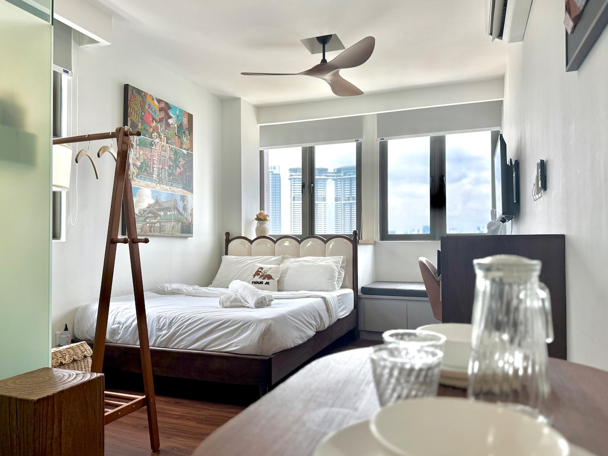 King Suite Home is 1 bedroom Apartment includes a full kitchen with refrigerator and microwave. These are family style suite with separated bedrooms, a living room and a dining area. Complimentary unlimited Wifi, TV, iron&board, hair dryer, laundry washer and dryer. This King Suite Home is a AIRBNB friendly apartment and accessible to enjoy many condo facilities. Comfortable, in style living area fitted with nice Sofa bed and coffee table. Separate room with Queen bed and 4-seater dining table.