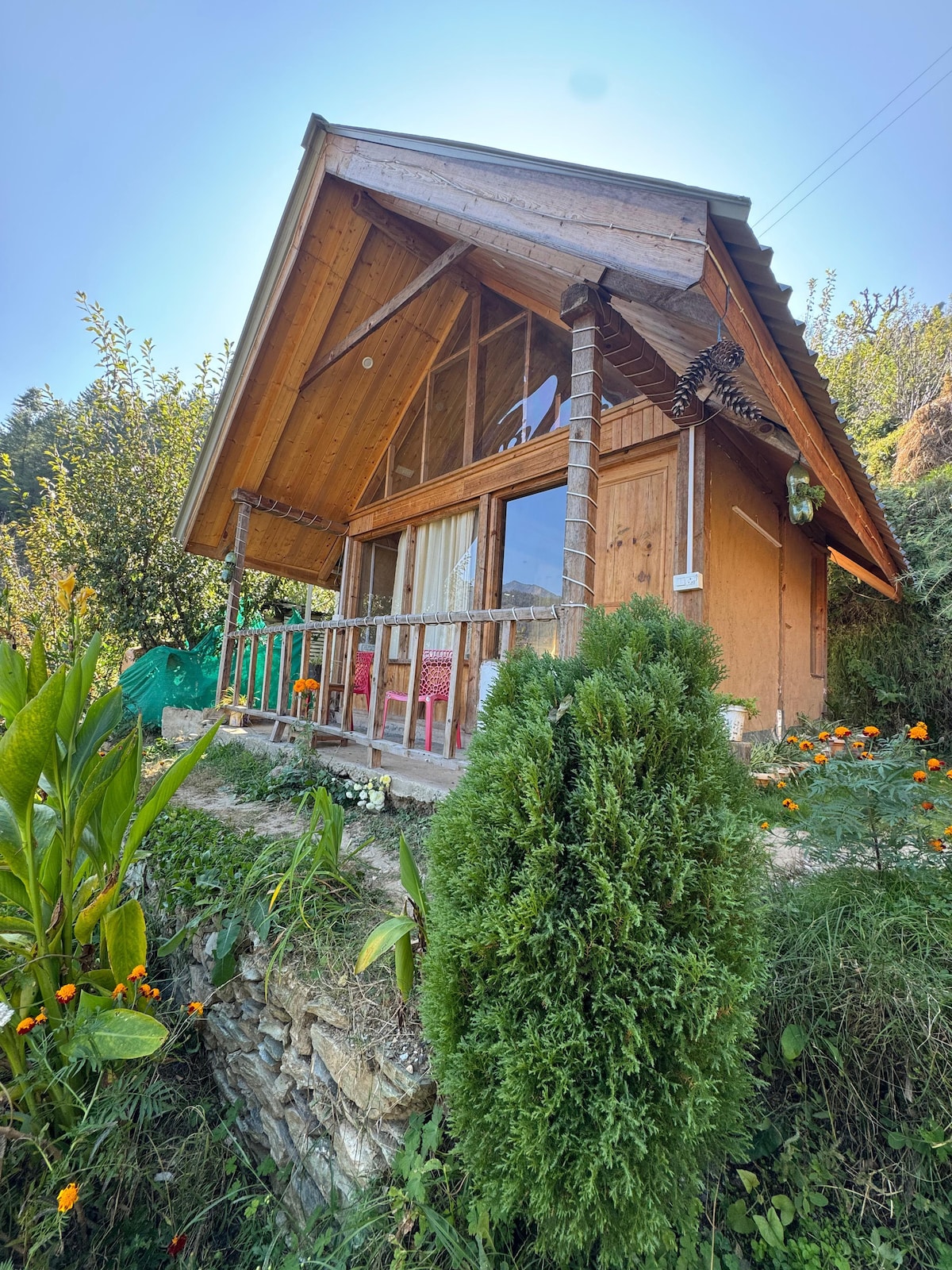 Welcome to a cozy glass-front wooden cabin tucked away in peaceful Sainj Valley, near the Great Himalayan National Park (GHNP). Surrounded by apple and plum orchards, this serene retreat is perfect for couples, solo travelers, and nature lovers. Wake up to sunrises over snow-capped mountains, chirping bird songs, and spend your evenings by the bonfire under starry skies. Enjoy fresh, local Himachali food and pure mountain air. Note: Guests above 50 years not allowed.