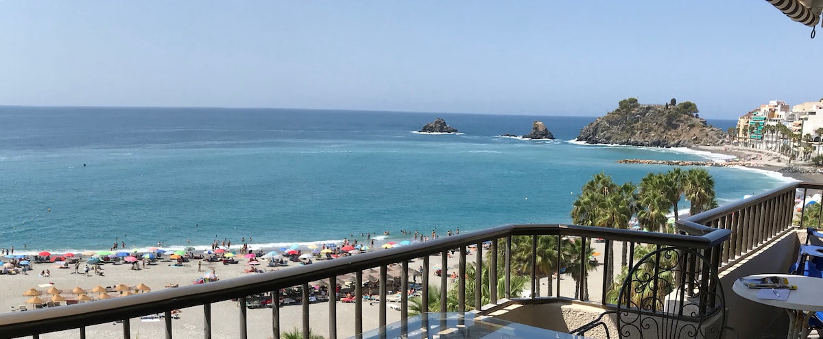 Atico en Almuñecar, capital de la Costa Tropical, con ubicación centrica en primera linea de la la playa Puerta del mar y vistas inmejorables al mar y a los peñones. Tiene un balcón privilegiado en el que puedes disfrutar en la mesa o sentarte en confortables sillones para tomar el sol. Atico, 7ª y ultima planta con 2 ascensores. Ambiente agradable todo el año. Parking interior privado. Almuñecar, tiene temperaturas medias de 25° en verano y 18° en invernio con poca lluvia!