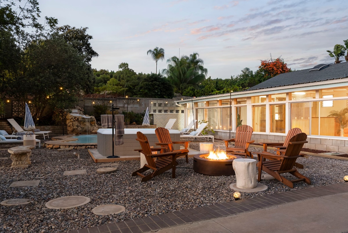 City skyline & sunset views from this spacious & bright 600 sq ft private cottage—just a short drive outside the city, in the foothills of San Diego. Located on a gated estate overlooking 30 acres of canyonland, it features a cozy Queen bed, 50” Smart TV, Wi-Fi, kitchen, A/C & heat. Unwind in the outdoor hot soaking tub, catch a movie under the stars, and spot wild peacocks roaming the grounds - a perfect retreat for those wanting a special getaway on a very unique property overlooking the city!