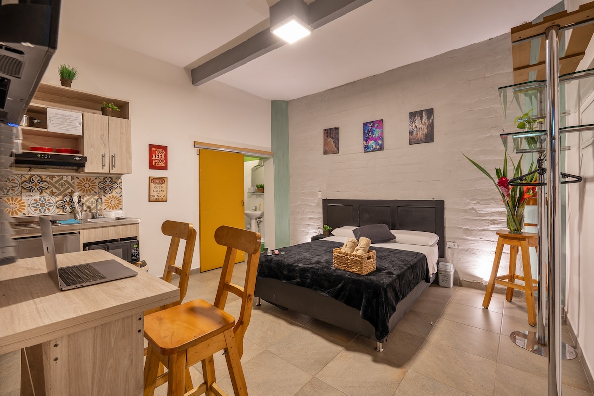 Rest and enjoy Medellín in this cozy studio for two. Queen bed, equipped kitchen, fast Wi-Fi, and Smart TV. Just 5 minutes from downtown, next to the tram with metro connection. Surrounded by restaurants, bars, and shops. Private bathroom and smart lock for a smooth stay. Perfect for couples or travelers exploring the city!