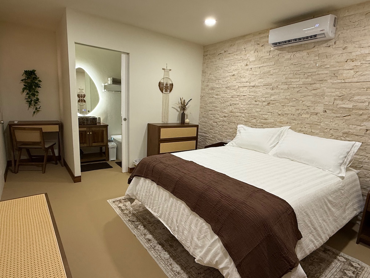 ¡Tu escapada perfecta te espera! Descubre nuestra habitación para parejas con una vista al lago de Ilopango impresionante, rodeada de exuberante jungla tropical. Diseño contemporáneo, cama queen-size con vistas panorámicas, balcón privado para atardeceres inolvidables. Equipada con aire acondicionado, WiFi y baño privado con agua caliente.