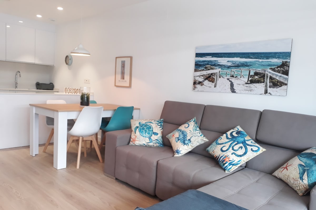 This comfortable 2 bedroom apartment has a master bedroom with a double bed and an ensuite bathroom with shower, another bedroom with two single beds, a fully equipped kitchen, toilet and an open lounge with a flat screen TV. It also has a private balcony. Este cómodo apartamento de 2 dormitorios (uno doble con baño privado y ducha) y uno con dos camas individuales, una cocina totalmente equipada, aseo y un gran salón abierto con un televisor de pantalla plana. También tiene balcón privado.