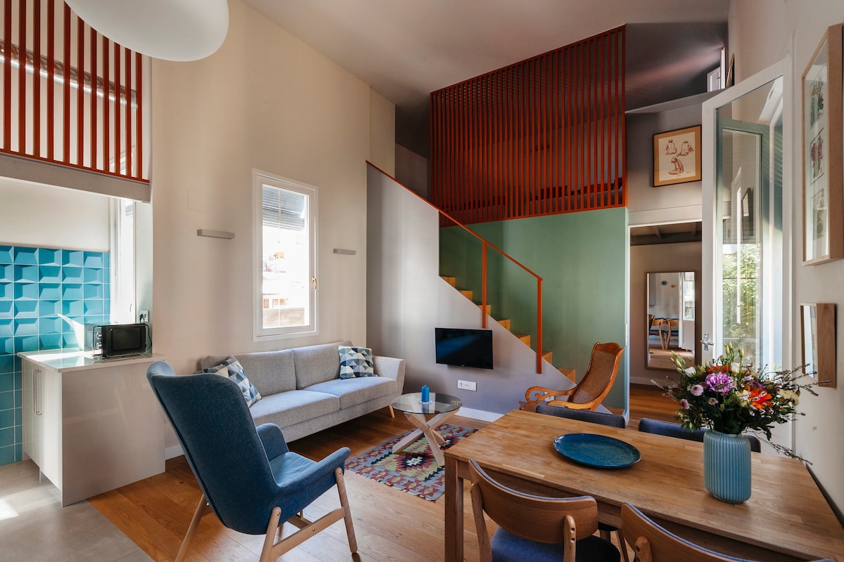 The 65 m2 apartment has been completely renewed recently with high quality materials and decorated in scandinavian style. in addition it has a 50 m2 terrace with plants on the top with a nice view of gardens It is located on the first flloor of a small house built on the backyard of a 1917's building. With 2 bedrooms is suitable for 4 people that can climb stairs and don't need to use a lift: a family with 2 children or a couple, that wants to have a studio or an extra room for guest.
