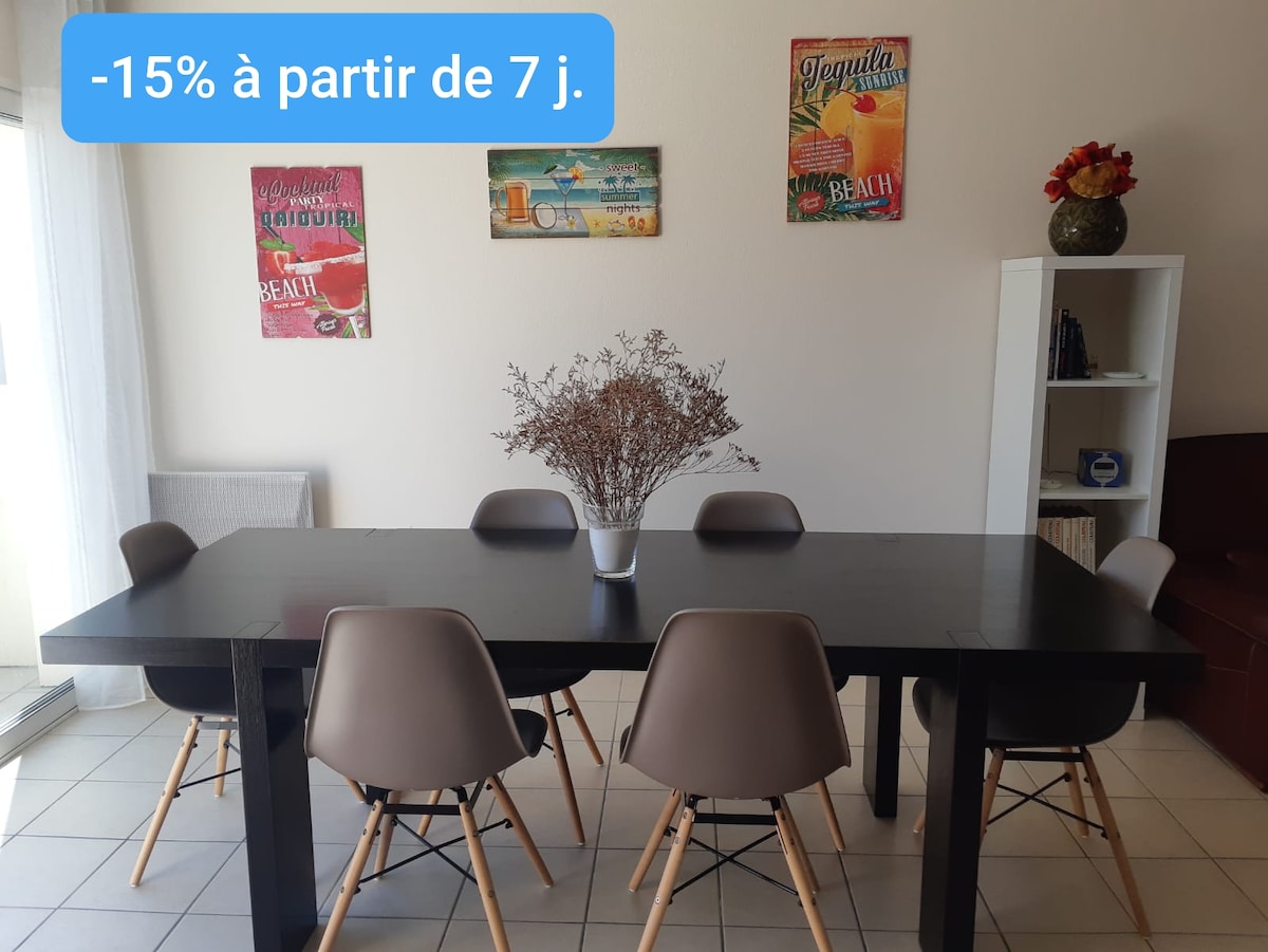 LOGEMENT T2 2 personnes possibilité de mettre un lit bébé dans la chambre. Dans le logement vous aurez une chambre avec placard, lit en 140cm draps fournis. une salle d'eau avec Wc, serviettes fournies. Un séjour avec clim, cuisine équipée, plaque induction 2 feux, micro onde grill, lave vaisselle, frigo, cafetière filtre, grille pain. Terrasse couverte donnant sur jardin, plancha, 2 transats, 2 vélos. WIFI, PAS D'ANIMAUX très calme,aucun vis a vis.