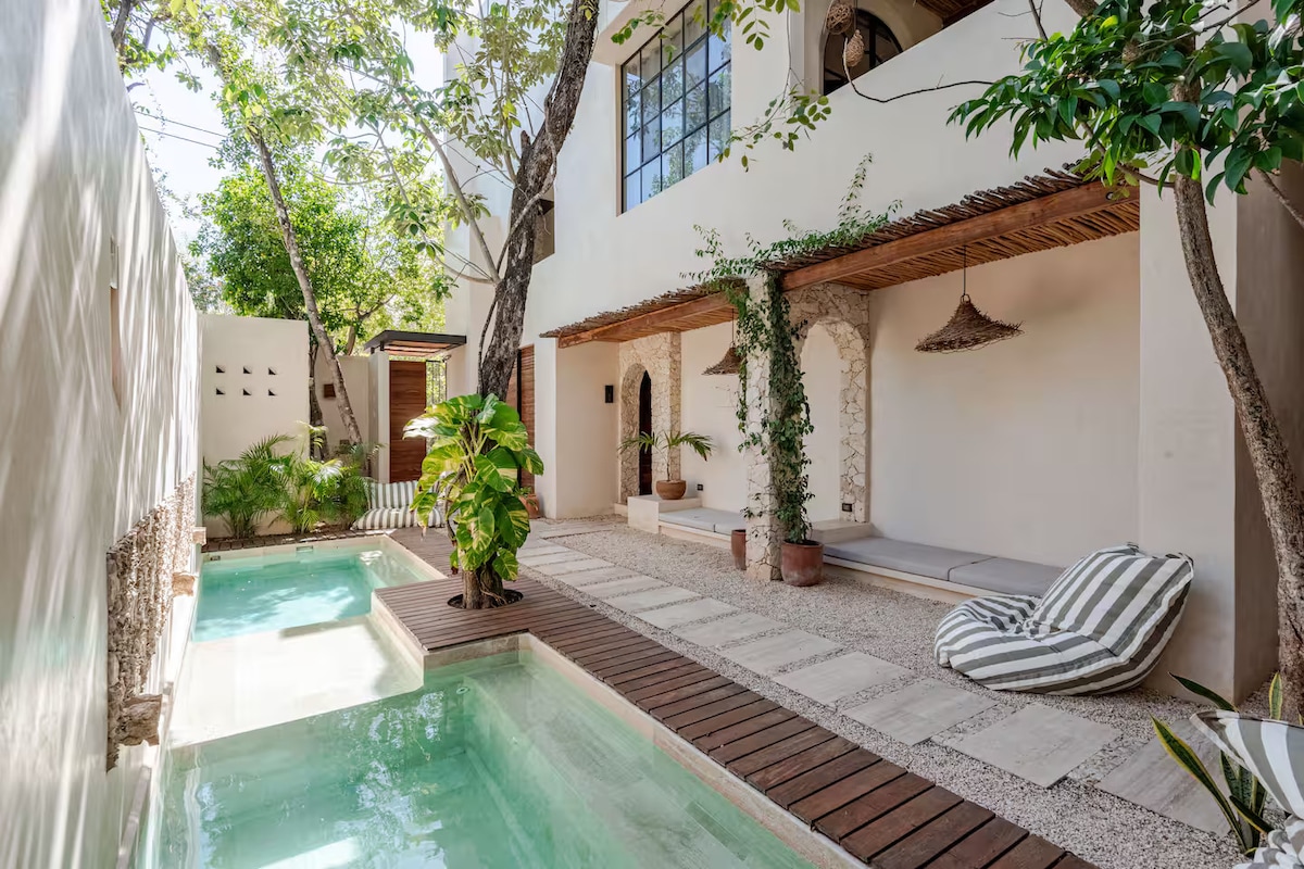 Casa Nómade is a 1600 sq ft / 140 sq mt boho-chic hideaway in La Veleta, tucked in a quiet boutique gated community near vibrant Calle 7. Unwind in your private jungle garden, a refreshing plunge pool with water cascade, and a built-in lounge for shaded afternoons. Inside, spacious areas meet handcrafted indigenous design. Enjoy a king bed, indulgent Yucatán Senses bath products, and high-speed Wi-Fi.