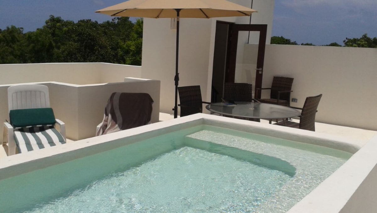 Tulums Adults Only Paradise! Luxury Penthouse Condo with a private heated jacuzzi on the balcony right outside of the bedroom. The condominium is close to the beach and to the downtown area. The condominium has 1 bedroom, full kitchen, dining & living room area, private roftop plunge pool and 1 bathroom.