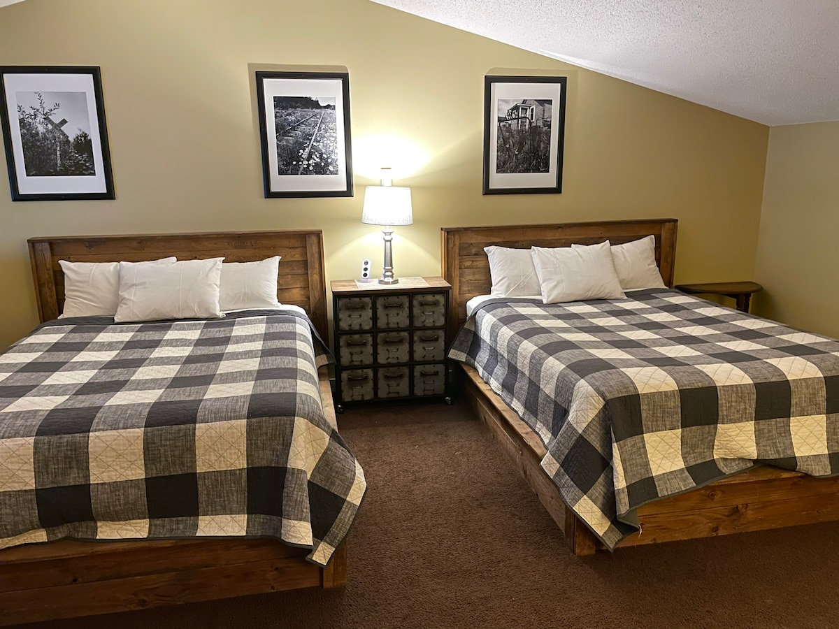 This room is set with a full size beds sleeps 2 people! Perfect for a couples or solo vacation. The room has its own private bathroom, fridge, microwave, and coffee maker. There is a community space with a kitchen and both an indoor and outdoor seating. The deck overlooks the lake and is a great place to gather with friends for dinner. Check out more at saglodge. com!
