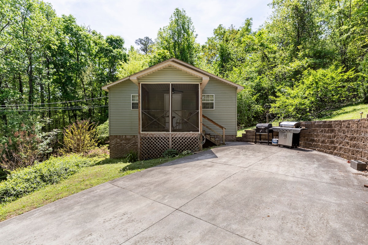 Our second home is a mix of mid-century modern and "cabin in the woods." It sits on 2 heavily wooded acres and backs up to a mountainside with rock outcroppings. The main living area (living room, dining area, and kitchen) is raised about 4 steps, and the bedroom and bath areas are on the main level. There is one large bathroom with a shower. There is an electric fireplace surrounded by ledge stone in front of the u-shaped built-in sofa. There is abundant reading material & 2 TV's.