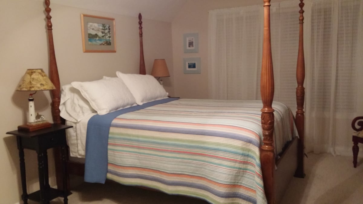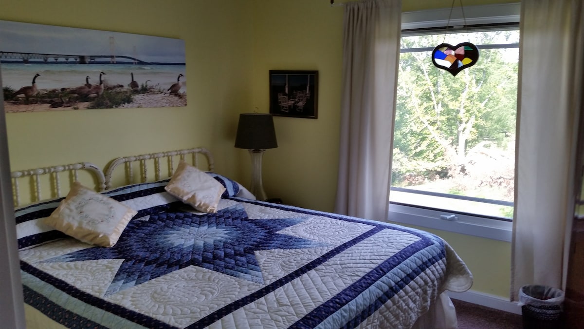 A private room with queen bed and private bath in Overlook Bed and Breakfast, located in the heart of Old Mission Peninsula. Only six miles north of Traverse City, Michigan, Overlook sits on acres of rolling hills facing East Grand Traverse Bay, including private beach access. The atmosphere at Overlook is bright, airy and casual. Our goal is to create homelike relaxation without homelike chores. You are here to refresh.