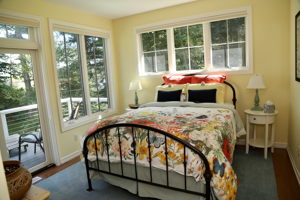 TULIP FESTIVAL May 6- Pamper Yourself in Luxury, including a full English breakfast! The Garden Suite boasts stunning views of the Kalamazoo River and lush landscapes from the bedroom and private deck. The bright and cozy suite features a queen-sized bed, a walk-in closet with mini-refrigerator, a private bath with shower, and is the only suite that doesn’t require climbing stairs. Just feet away from the common area living space and communal pantry Luxury, privacy, and hospitality await you