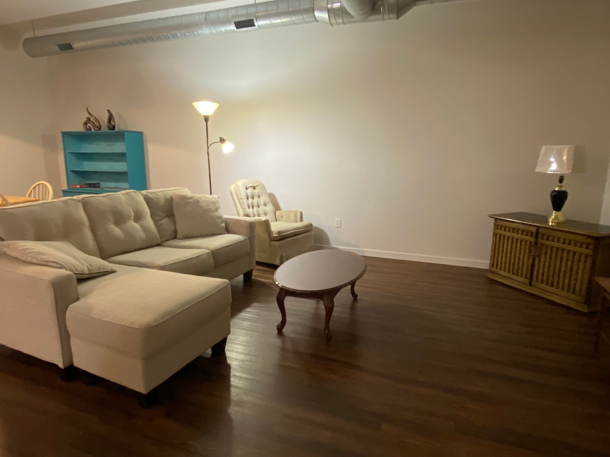 Very unique apartment downtown Otsego, walkable to shops, restaurants and bars. Recently renovated, this space sits above the vault of a 1920's era bank with a rustic/industrial feel. Featuring rustic ceramic tile in the kitchen, bathroom and work area, bamboo floors in the living/bedroom, granite counters, tile backsplash, copper sinks, and tile shower with glass door. 65" smart flatscreen tv, electric fireplace, WIFI, Central Air/Heat, and built in butcher block desk.