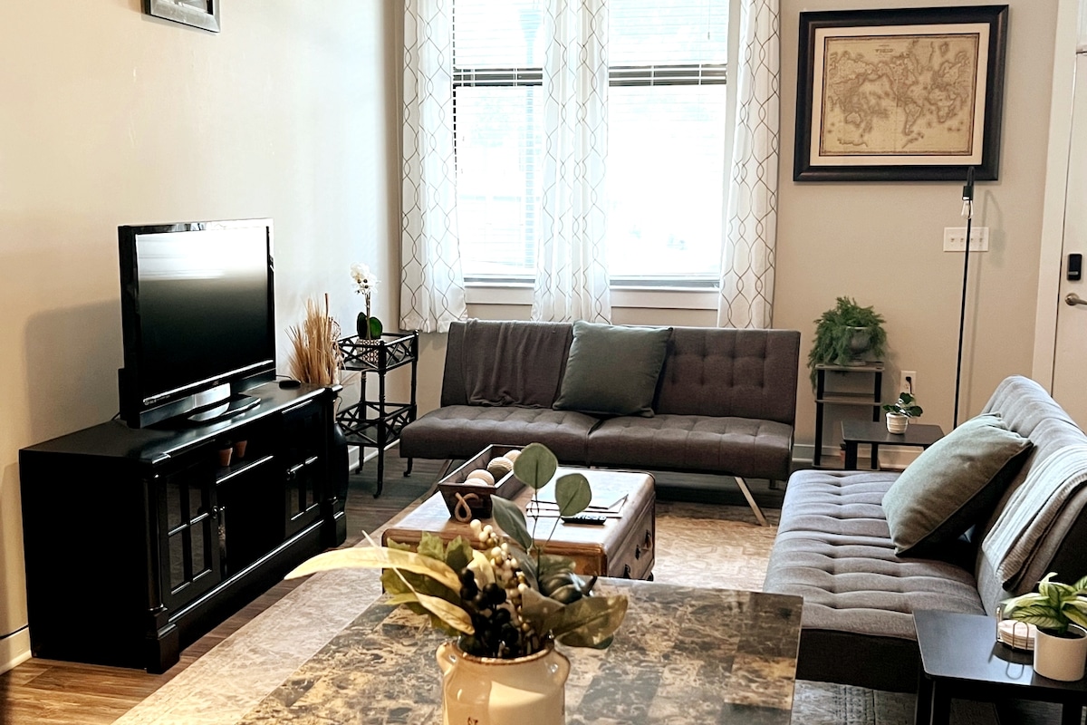 Upscale suite w/King & Queen sized beds. Enjoy 750+ square feet of comfortable living space in NoDa district near Uptown Charlotte. Right off LIGHT RAIL and conveniently located minutes from the city's best venues, food & shops bars, and activities. Popular location with the area's largest employers and hospitals nearby. Everything you need to enjoy your stay, full kitchen, basic cookware, beautiful appliances, high-speed WiFi, outdoor patio, gym, pool. Free parking and easy Uber/Lyft access.