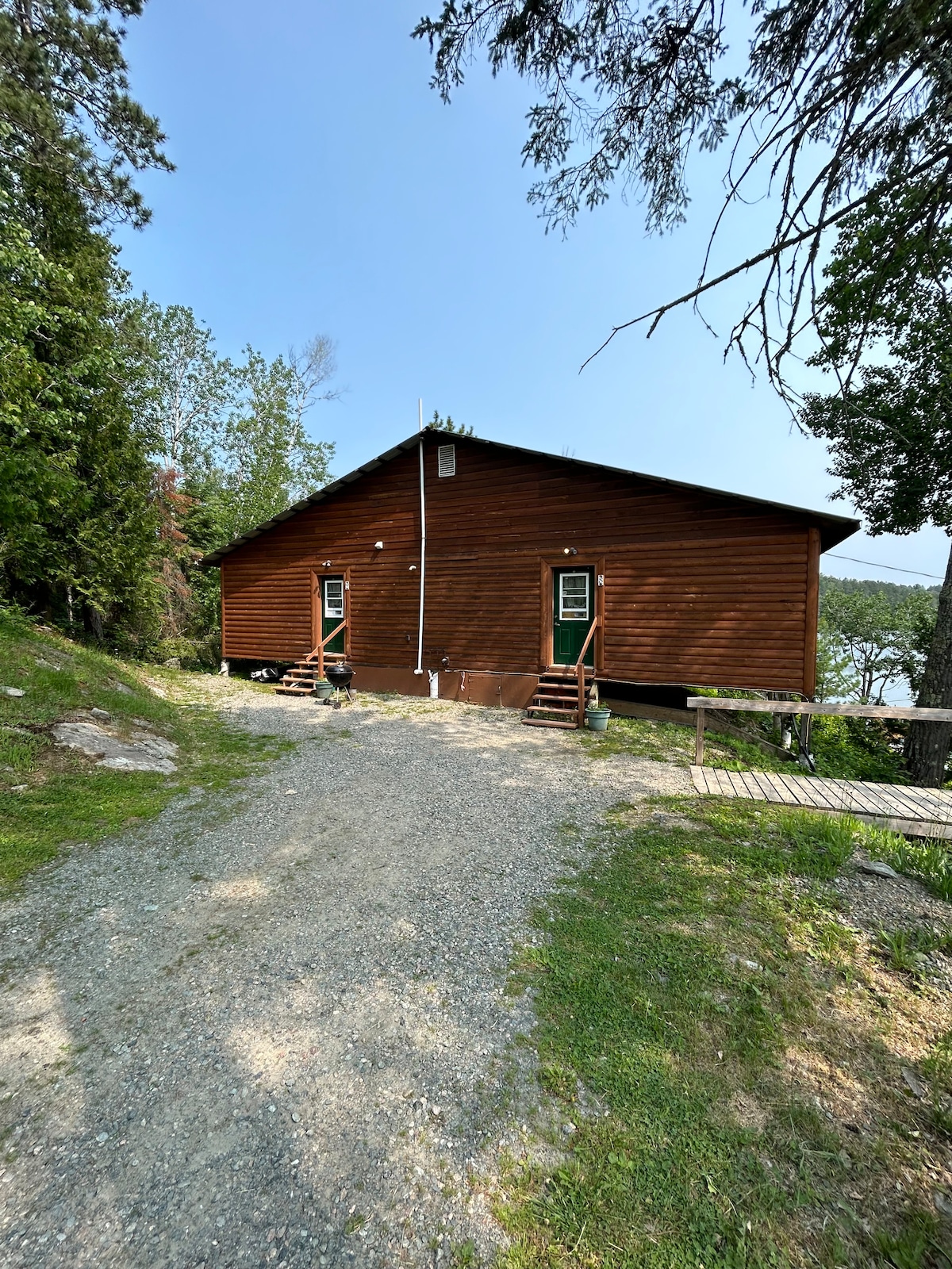 Enjoy our unique West Coast style cabin on beautiful Black Sturgeon Lake. Built in 2002, the cabin is nestled in the trees, and has gorgeous views of the lake. The open concept cabin is bright and airy with 20 foot ceilings and tons of lake front windows. A separate guest cabin can accommodate more guests and offer complete privacy from the main cabin. We have high speed, reliable internet for streaming and working remotely. This cabin is a great getaway any time of the year!