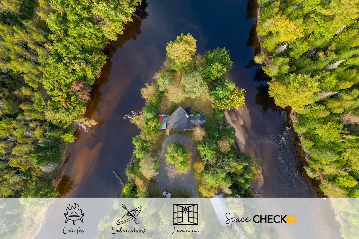 Owl’s Nest welcomes you to serenity and a total reconnection to nature CITQ 296955 Tucked among towering white pines, Owl’s Nest is your riverside hideaway. Step out to the Ouareau River, soak in the hot tub, or simply listen to the water as you drift to sleep. ✔ Direct access to the Ouareau River ✔ Hot tub under the stars ✔ Master balcony with forest + sunset views ✔ Cold-plunge friendly swimming ✔ Surrounded by nature and medicinal plants