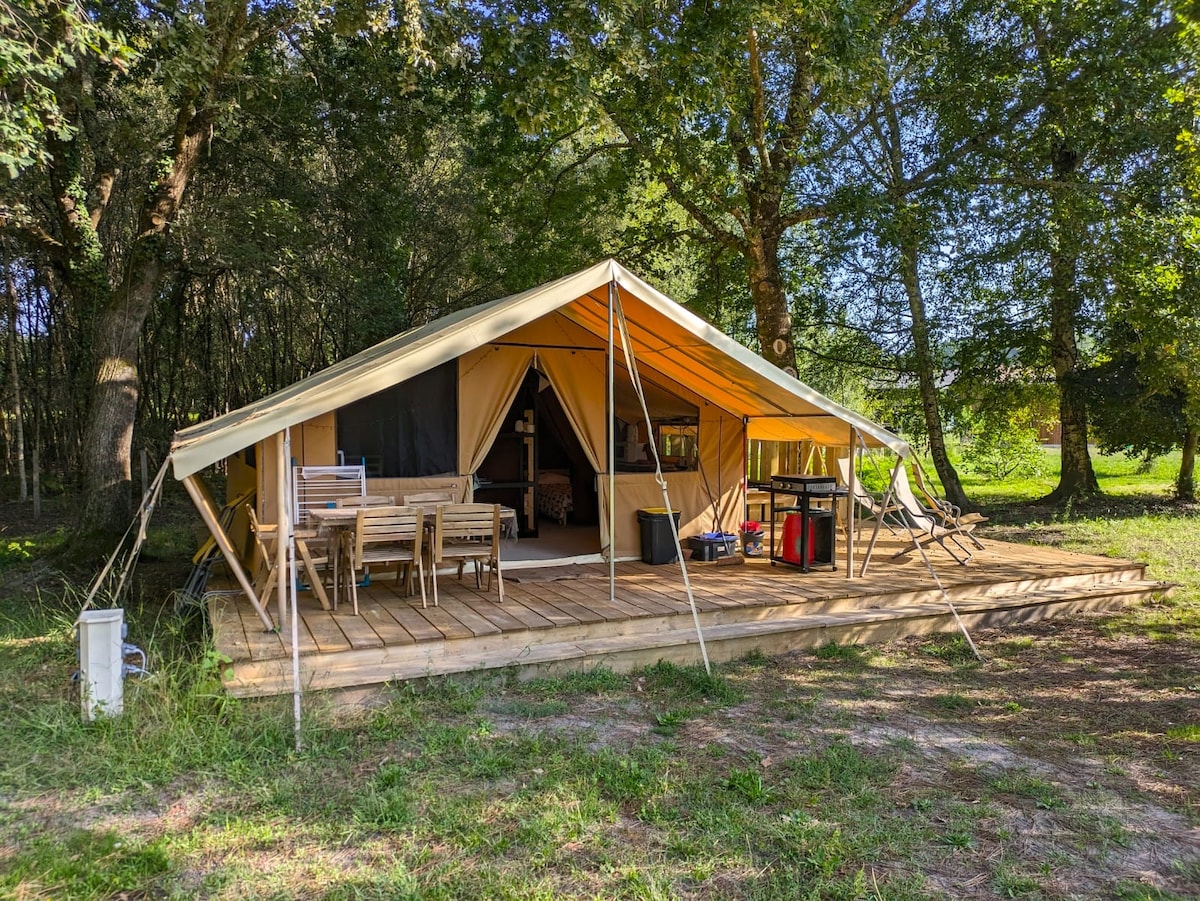 Nichée dans un parc arboré privé, notre tente lodge offre intimité et sérénité. Découvrez ce lieu atypique et enchanteur, pour une escapade en famille, entre amis ou en couple et profitez des nuits paisibles dans notre tente spacieuse et confortable. Pour la plus grande joie des enfants découvrez l'espace extérieur avec piscine privée et trampoline. À la nuit tombée, plongez dans une atmosphère enchantée et romantique à la lueur des lanternes et savourez les douces soirées sous le ciel étoilé.