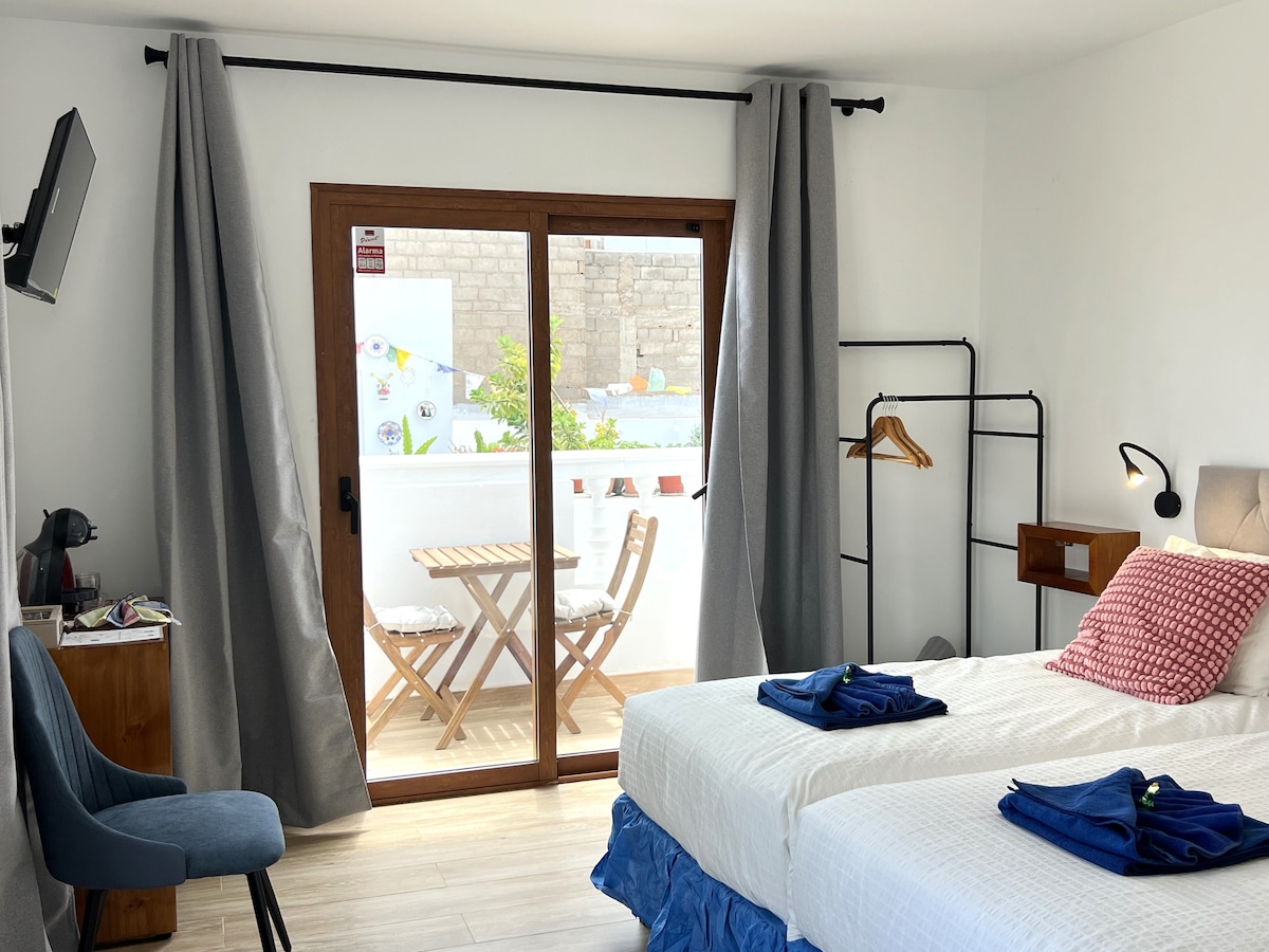Habitación en suite situada en primera línea del paseo marítimo de Playa Blanca, (Isla de Lanzarote, Islas Canarias, España). Diseño moderno, con mucha iluminación y amplitud; Se distribuye en un espacio totalmente diáfano que incluye: Vestidor, baño completo, pequeño office con: nevera, congelador y horno/microondas, escritorio, terraza con vistas al mar y a nuestra isla vecina (Fuerteventura) . Cuenta con aire acondicionado/ calefacción, WiFi gratuito, caja fuerte, y smart TV.