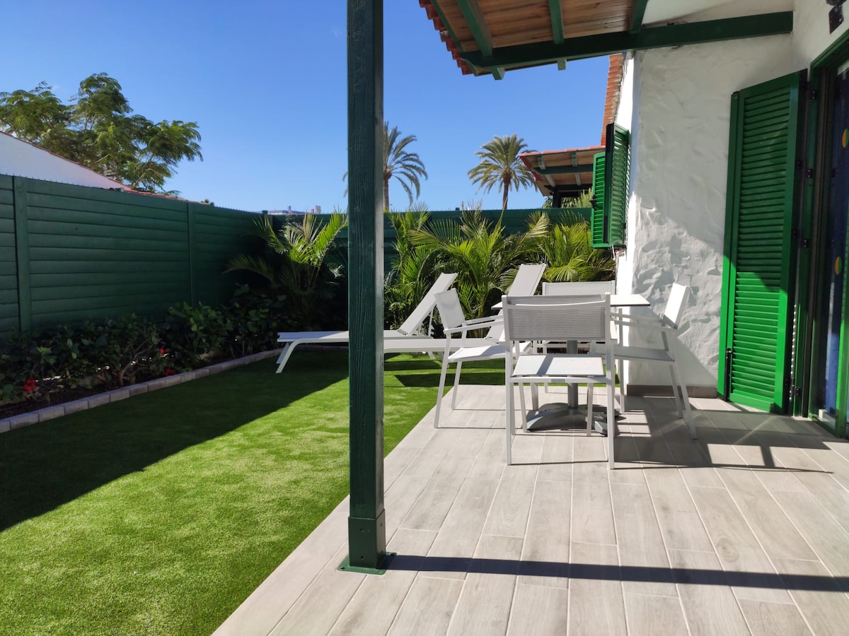 Comfortable and elegant Bungalow next to the International Golf Course of MASPALOMAS and Tenis-Padel Center. It has just been renovated and has all the amenities for the enjoyment of our guests. The bungalow can comfortably accommodate 4 people in completely separate bedrooms. It has a total of 50m2 with a private garden at the entrance. The terrace has a private atmosphere, with a decoration and illumination very cozy and romantic to spend special nights.