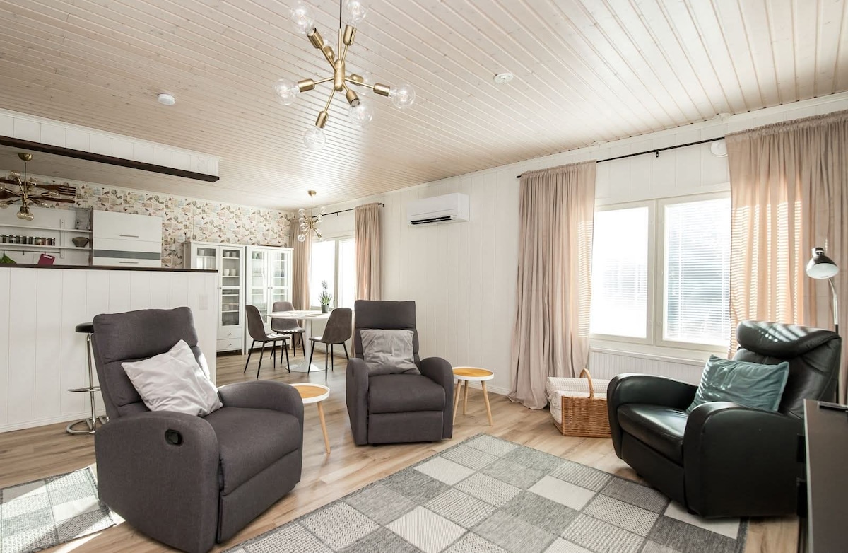Villa Flora is a spacious, cozy, and home-like 150m² two-story accommodation, perfect for a relaxing getaway or small gatherings. Comfortably sleeps up to 10 guests – 5 beds, 5 extra beds, and a baby crib on request. A fully equipped kitchen (including champagne glasses), a sauna for relaxation, and a washing machine for convenience. Prime location in Kauhajoki center – shops, restaurants, and the church are just a short walk away.