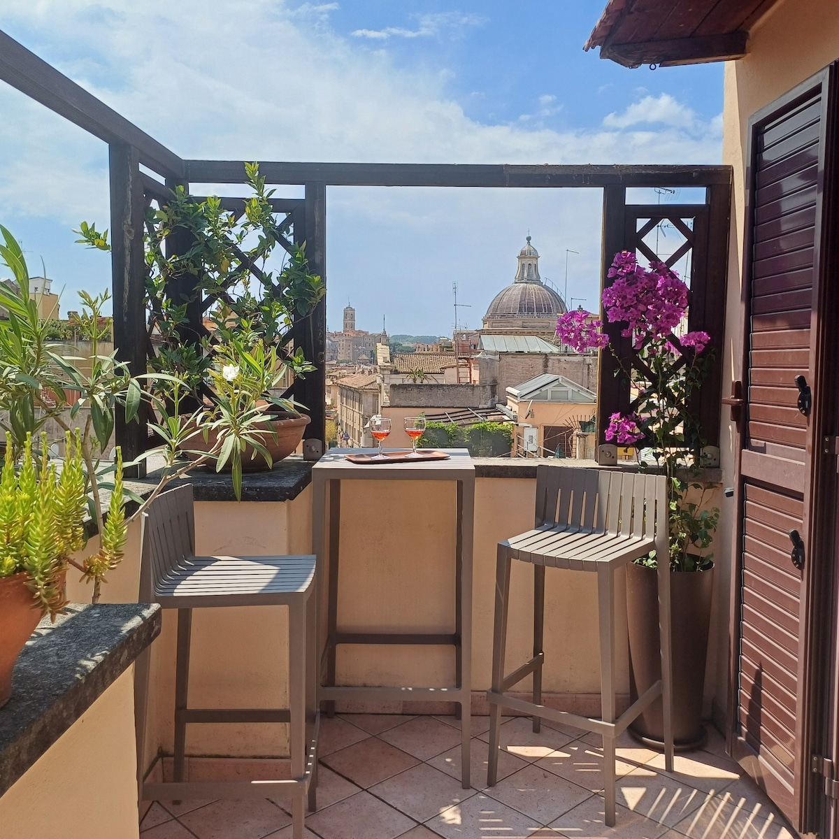 Bright and quiet penthouse apartment in the heart of Trastevere, with a wonderful terrace and an unparalleled view of charming roman roofs and the Gianicolo hill. The flat is meticulously refurbished and set in a picturesque cobblestoned street, just around the corner from the lively restaurants and cafes. La Casetta al Mattonato is located on the 3rd floor (41 steps, no elevator) of a 1600s typical roman building, within walking distance of all major attractions.