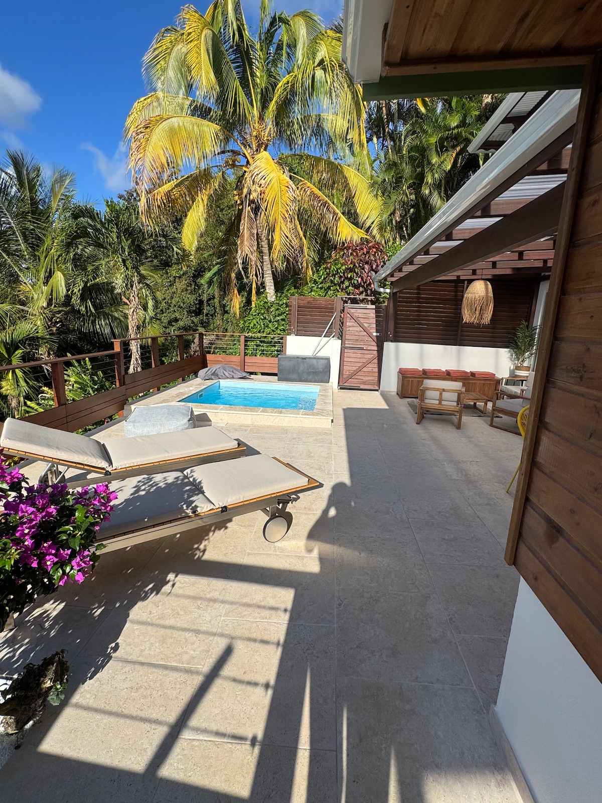 A l'ombre du merisier, protégé par le cocotier et le latanier la "kay a fwi" vous accueillera dans un jardin tropical. Situé dans un quartier calme et ventilé, vous serez bercé par le chant des oiseaux et la mélodie des feuilles de lataniers. Dès les premiers rayons de soleil, l'eau de votre piscine privative se réchauffe pour des bains de jour comme de nuit en toute intimité.