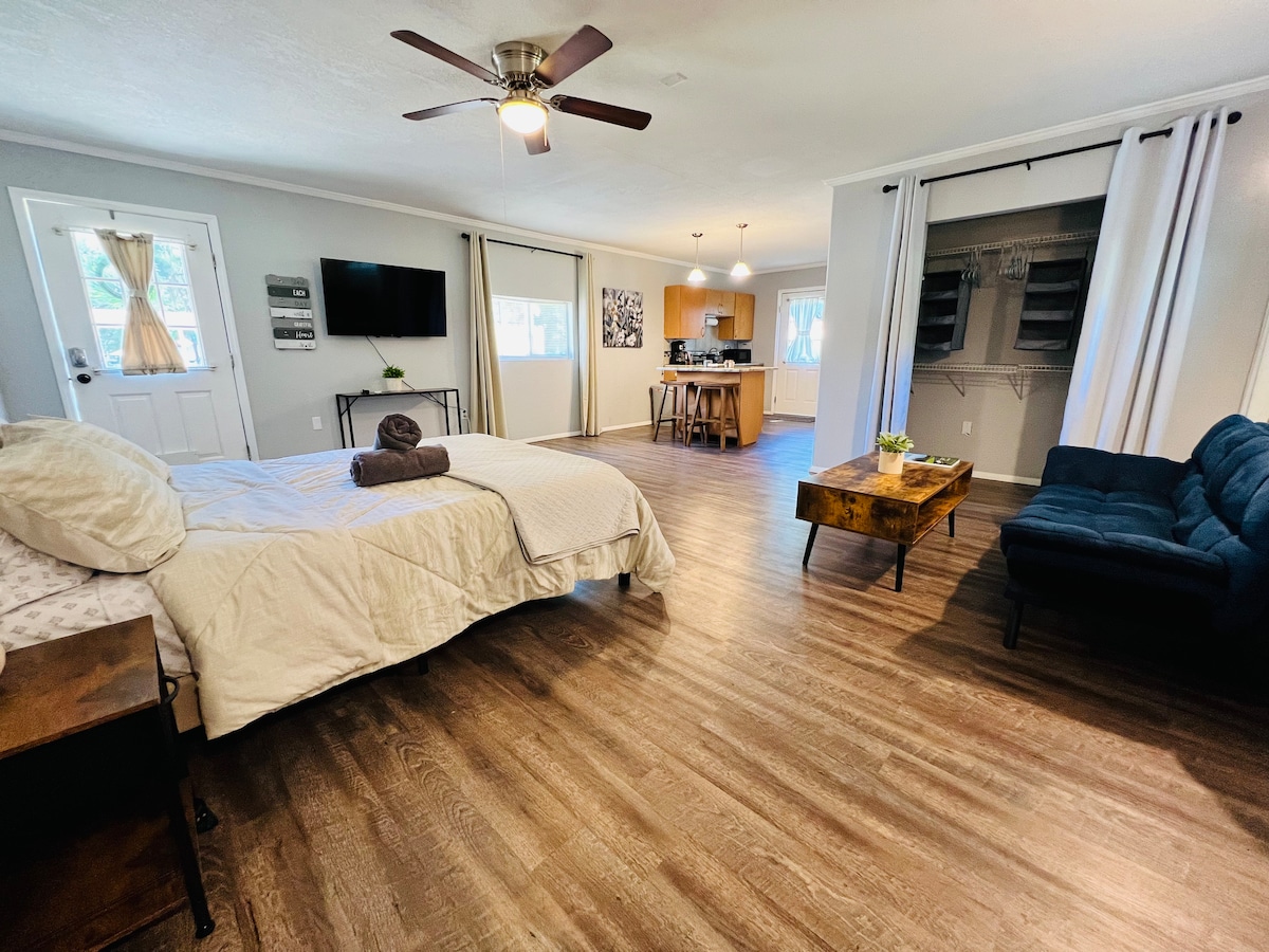 Private guesthouse in a quiet, rural area of Lady Lake. 1 bedroom, 1 bath, furnished with pool privileges. Kitchen, dining bar, living room and sunroom. Sunroom opens to the pool deck and sparkling blue pool, which is completely privacy-fenced in a common area shared with the owners. Suitable for 1 or 2 adults. Central heat and air, 40” Smart Television , WiFi, washer and dryer. Bed linens and bath towels provided. Kitchen with full sized refrigerator/freezer ice maker and electric stove.