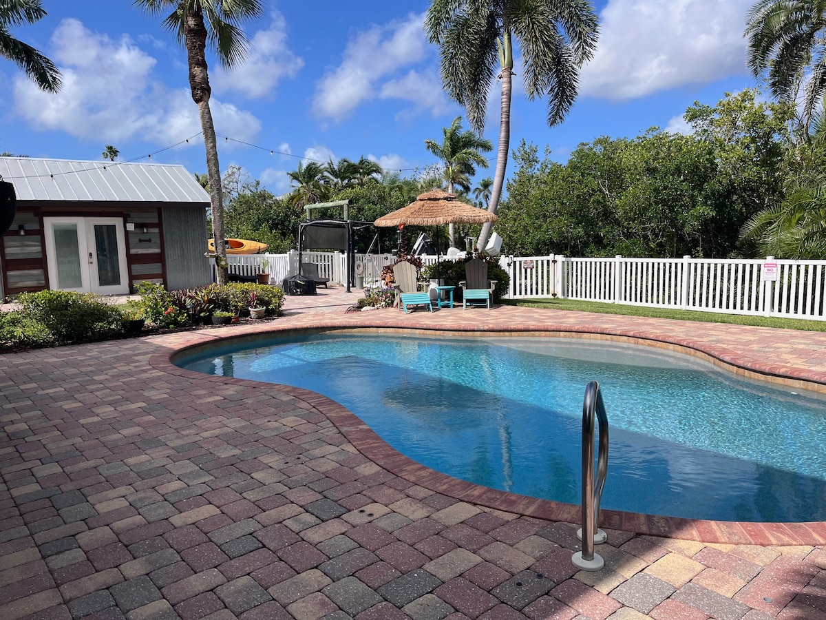 $million home located in the heart of S Fort Myers close to EVERYTHING. Kayak out of the pet friendly fenced backyard through miles of pristine mangroves, gorgeous saltwater pool; 13 miles to Sanibel Island, 6 miles to Fort Myers Beach. Walk to Lakes Park and visit the farmers market/Wednesday mornings or walk to Castle Golf (award winning mini golf). Biking trails everywhere. Near: Walmart, restaurants; Publix and Aldi's. 1 Bed/1 bath/kitchen 1st floor unit with own entry. en la planta baja