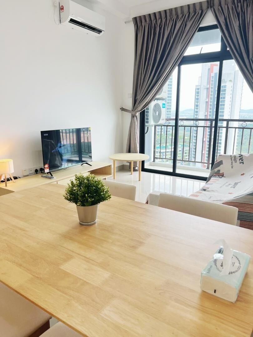 Our Minimalist home is your ideal tranquil heaven. Escape from the daily hustle and bustle, immerse yourself in the tranquil cosy comforts. The beautiful high floor Seaview and it's great location are suitable for couple and whole family who seeking for a get away trip. Only 5mins away frm Sg. 3-5 mins walk to Familymart, Starbucks, Restaurant, Movie theatre Sunway Big Box Retail Park, X Park and etc. 8 Mins drive to Legoland. Relax with the whole family at this peaceful place to stay.