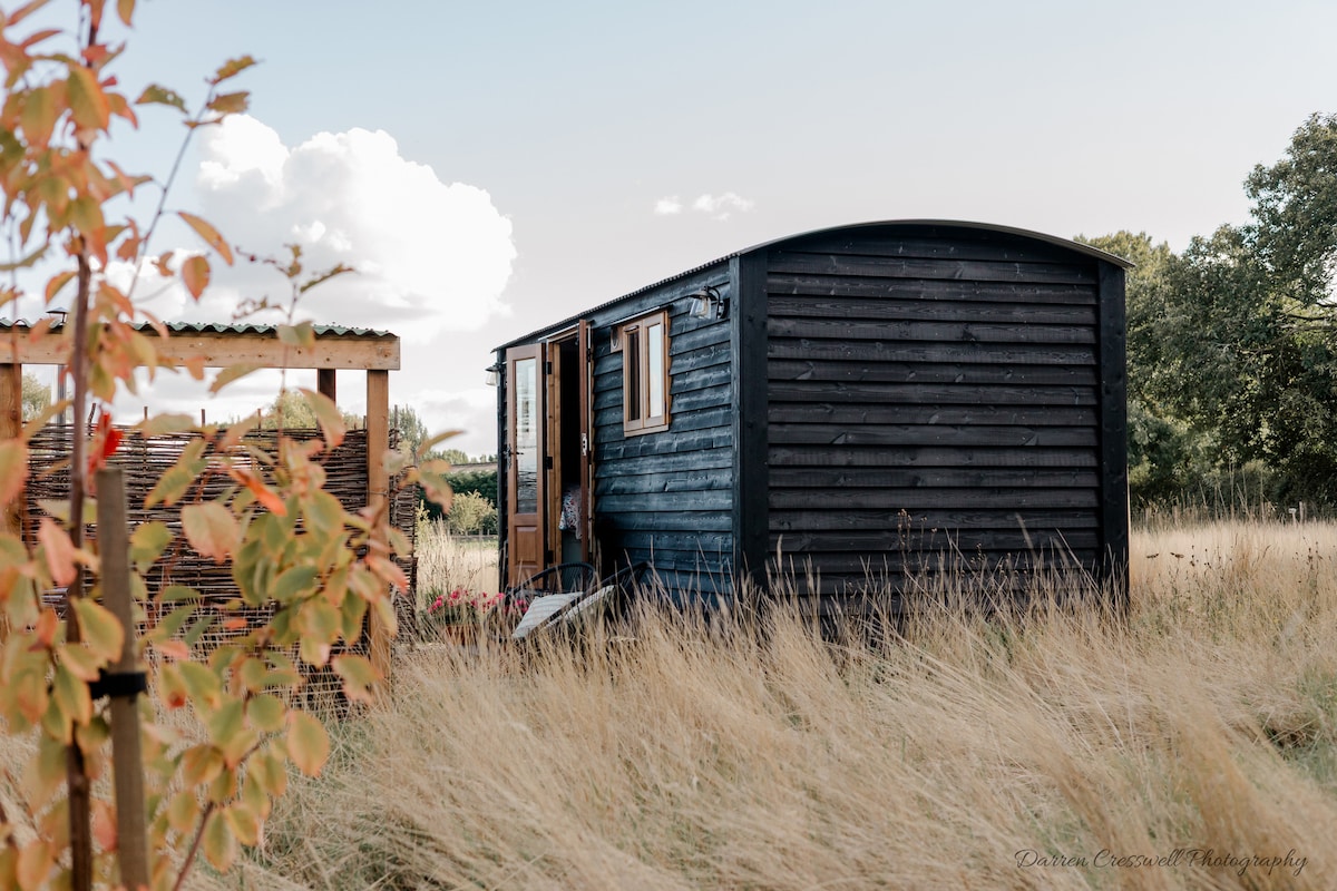 Welcome to Drift View, lovingly designed and built by ourselves and set on our family farm close to the Rutland/Leicestershire border. The hut is positioned in a private and secluded orchard, next to the farmyard and offers stunning views of the rural landscape. You can experience the peace and tranquillity the location provides whilst enjoying the luxury of the shepherds hut which has an en-suite with shower, fully equipped kitchen, double bed and both indoor/outdoor dining areas.