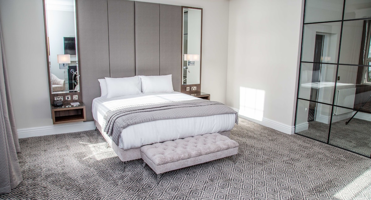 Our double rooms offer a spacious option for travellers, with rooms featuring one double bed (4 foot 6 inches wide). The triple glazed windows ensure any external noise is kept to a minimum. All rooms have an en-suite bathroom with bath, shower, toilet and sink, as well as complimentary toiletries. Coffee and tea making facilities are provided in the room. There is complimentary Wi-Fi throughout the hotel and in all rooms. Keep all of your valuables secure in our in-room safe. TV with a selection of Irish channels can be found in the room. Iron and ironing board and ice are available on request from reception.
