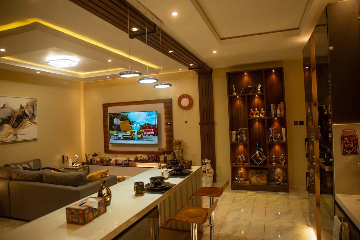 #1 Oakville is a stunning 2 bedroom apartment for your ultimate comfort and designed with exceptional level of quality and elegance. 24 hr power enabled with backup generator and a 10kw Lithium battery. The kitchen is exceptionally equipped from Air fryers to toaster, coffee maker, rice cooker, frost free integrated fridge/ freezer etc. The living room comes with 65 inch smart TV, starlink internet.