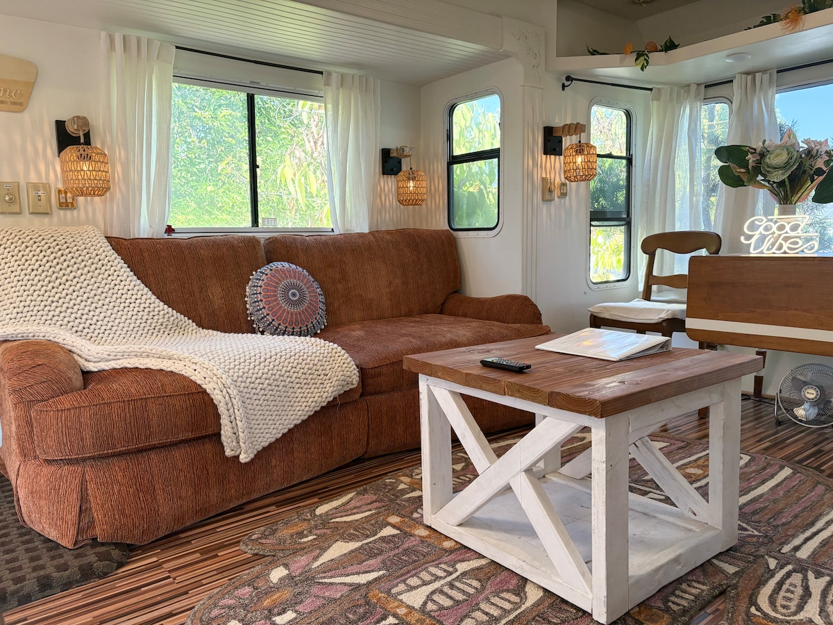 Interested in a unique, affordable and sustainable stay to explore So Cal from a safe, quiet home base? Then this bright, high-end resort coach upcycled to a teeny tiny home is for you. She's not a standard house or stale hotel, she's special, private and has a twinkling yard space & parking for you. Full size fridge, stove top, microwave, cookware, coffee maker, cream/sugar, fast wifi, washer/dryer, large TV with Firestick, desk area, queen size bed, deluxe sofa and tree shaded picnic table.