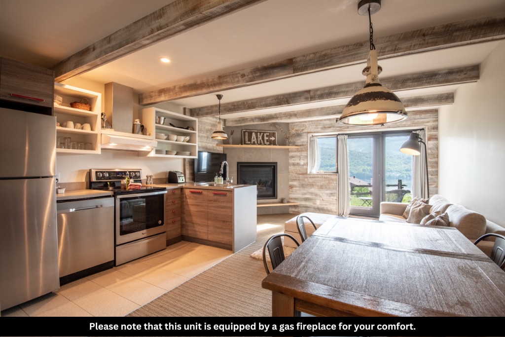 Cozy and warm condo located on the shore of Lake Tremblant, fully renovated, with an amazing view of the ski hills, village, and the lake. The condo is equipped with an HD TV, unlimited speed internet, fireplace, full kitchen, and A/C. The unit has one bedroom with a Queen bed and a living area with a sofa bed that can accommodate 2 kids . The unit can sleep comfortably a family of 4 (with kids)
