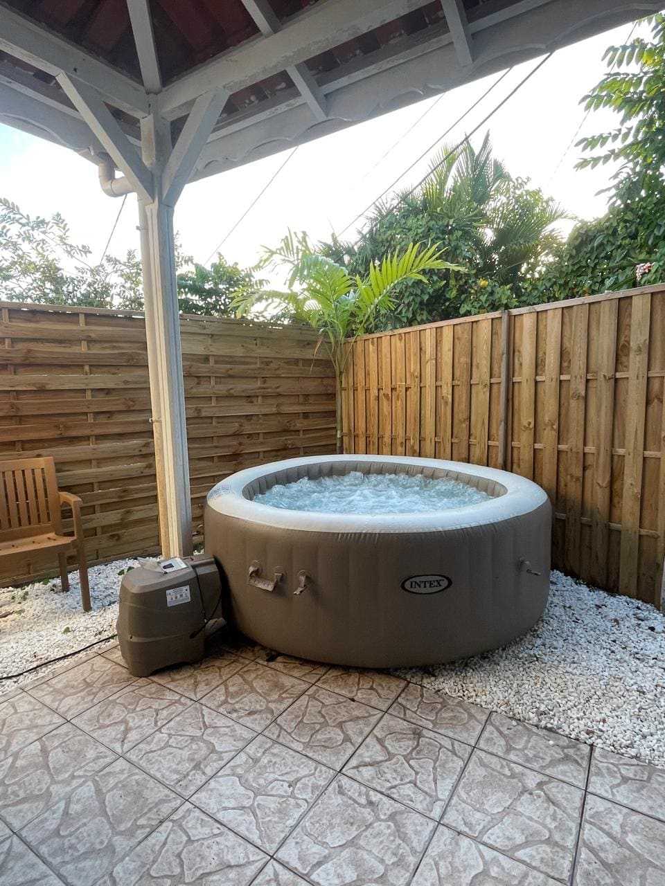 Quiet, romantic 2-room apartment 105 m2, intimate with its private "pool house" space, just for you whith: spa, swimming pool, barbecue, plancha, Ping Pong and relaxation area. All in a green setting with a panoramic view of the Caribbean Sea, Mount Pelée and the bay of Fort de France. Restaurants and shops are 2 minutes by car from Bourg des Trois-Ilets and the most beautiful beaches are 10 minutes away.: The best geographical location for visiting the island. Closed parking. Fiber internet
