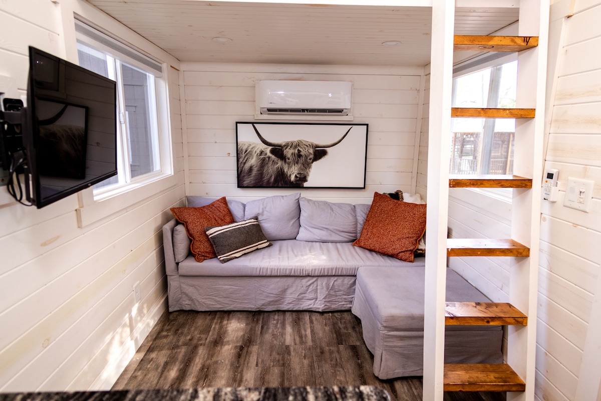 Welcome to Unit 5, your cozy tiny home gorgeously designed for up to 4 guests. Enjoy all the tiny house storage hacks! Inside, find a comfortable full-size loft bed and a convenient queen-size sofa bed. The spacious bathroom features a standing shower and full toiletries. A well-equipped kitchenette includes a mini-fridge, microwave, and dishes. Relax in the inviting living area with a couch, chair, and 36-inch Roku TV. Enjoy a charming and functional space for your Williston getaway!