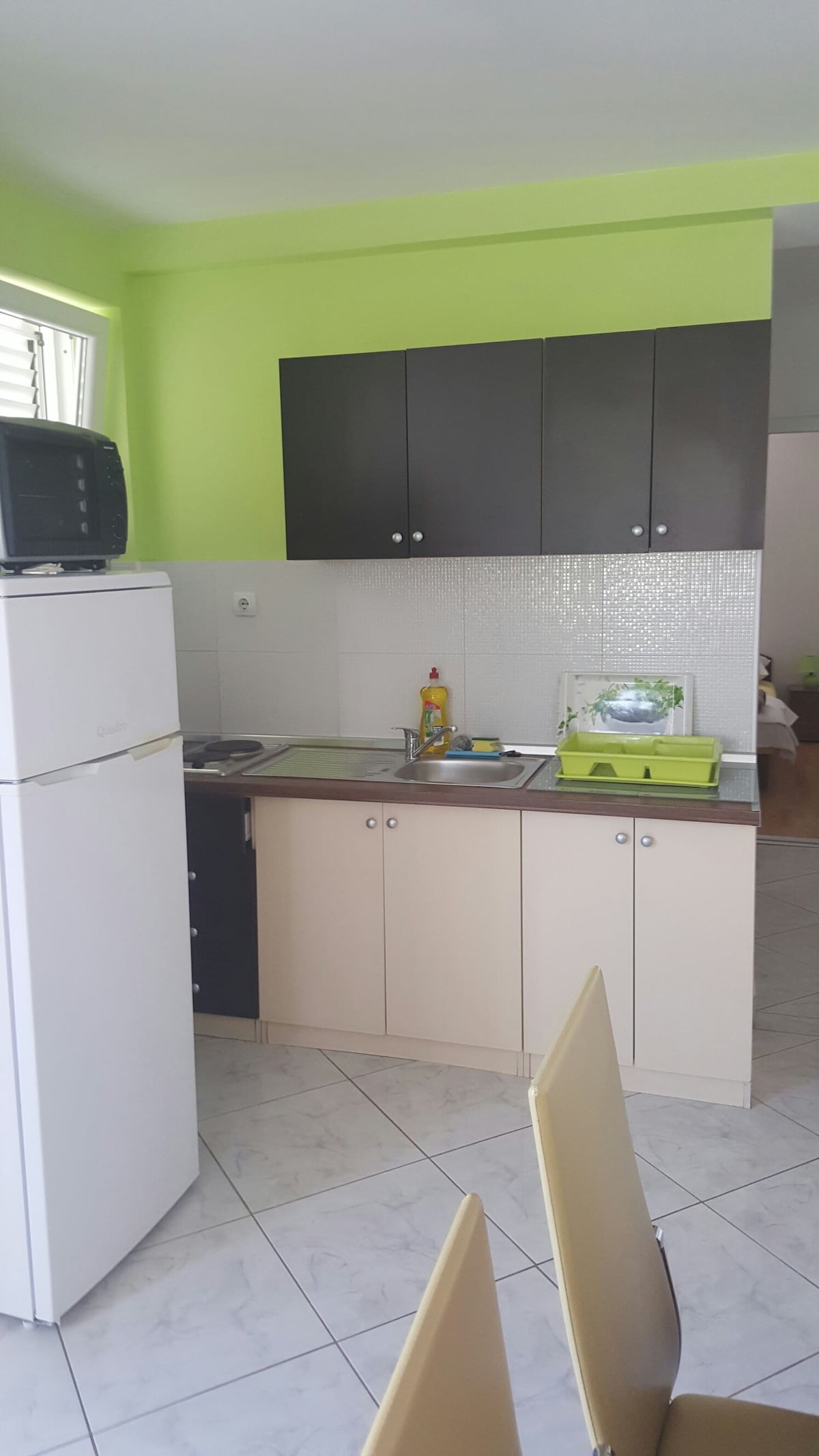 Wir haben eine Wohnung mit Miniküche, eigenem Bad, eigenem Eingang und Terrasse. Die Wohnung ist für zwei Personen ausgelegt. Die Miniküche beinhaltet Kochutensilien, zwei Herdplatten, Kaffeemaschine, Kühlschrank zur Aufbewahrung frischer Lebensmittel. Der Stil und die Konstruktion sind in einem rustikalen Stil, der einer vergangenen Ära gewidmet ist.