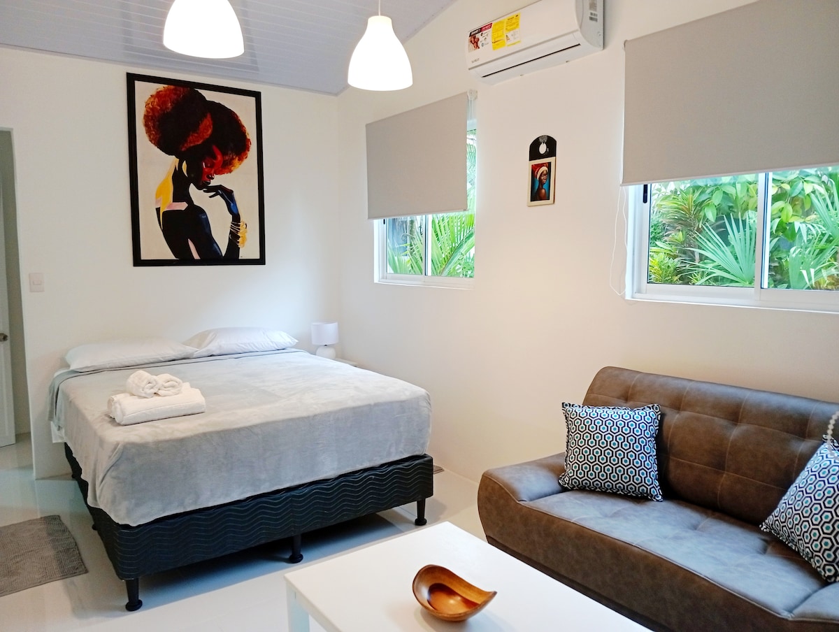 Studio with a double bed, private bathroom, equipped kitchen, A/C, Tv and nice terrace. Located in a relaxing garden, with swimming pool for share. 300m from Black beach and less than 1km away from Cahuita main street and the beautiful National Park. Also supermarkets, shops and restaurants are nearby. Wi-fi, parking.Cleaning every second day. weekly rental once a week cleaning service.