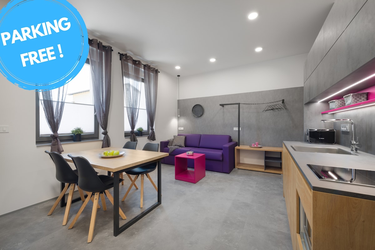 Brand new, perfectly located, modern and fully furnished luxury apartment. Less than 10 mins to the Ljubljana’s most charming part of the old town and just a few minutes walk from the main bus/train station. Free secure off street parking in the garage under the apartment. Complimentary bikes and a beautiful private patio with outdoor sitting, perfect for lazy morning breakfasts, lounging and dining. Self-checkin. Ground floor-direct access.
