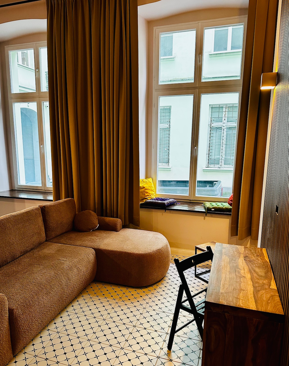 Luxurious 44 m² privacy in the heart of Łódź with a 4m high ceiling and floor heating. Designed for business trips, romantic getaways, and longer stays. Private entrance in the courtyard. - Loft bed with award-winning mattress (140 × 200) and blackout curtains. - Large, cozy sofa and work desk. - Induction hob, microwave, dishwasher, and quality kitchenware for dining. - Walk-in shower, and a separate toilet. Located near Piotrkowska Street and within walking distance of all attractions.