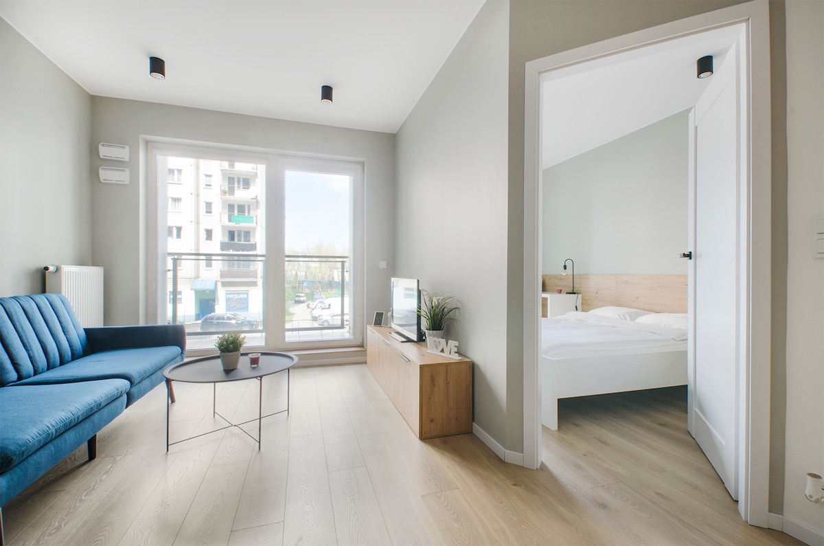 This modernly finished and furnished apartment is located in secured compound in the heart of the city of Lodz. Spacey living room with comfortable sofa, table and 4 chairs, TV cabinet and 55" TV with Play Station for with games as in the photo and with apps like Netflix, Apple Tv, Max, Prime is connected to fully equipped kitchen. Main bedroom queen size bed. Spare bedroom- double bed. One parking spot is dedicated for you, inside the secured area, next to the building.