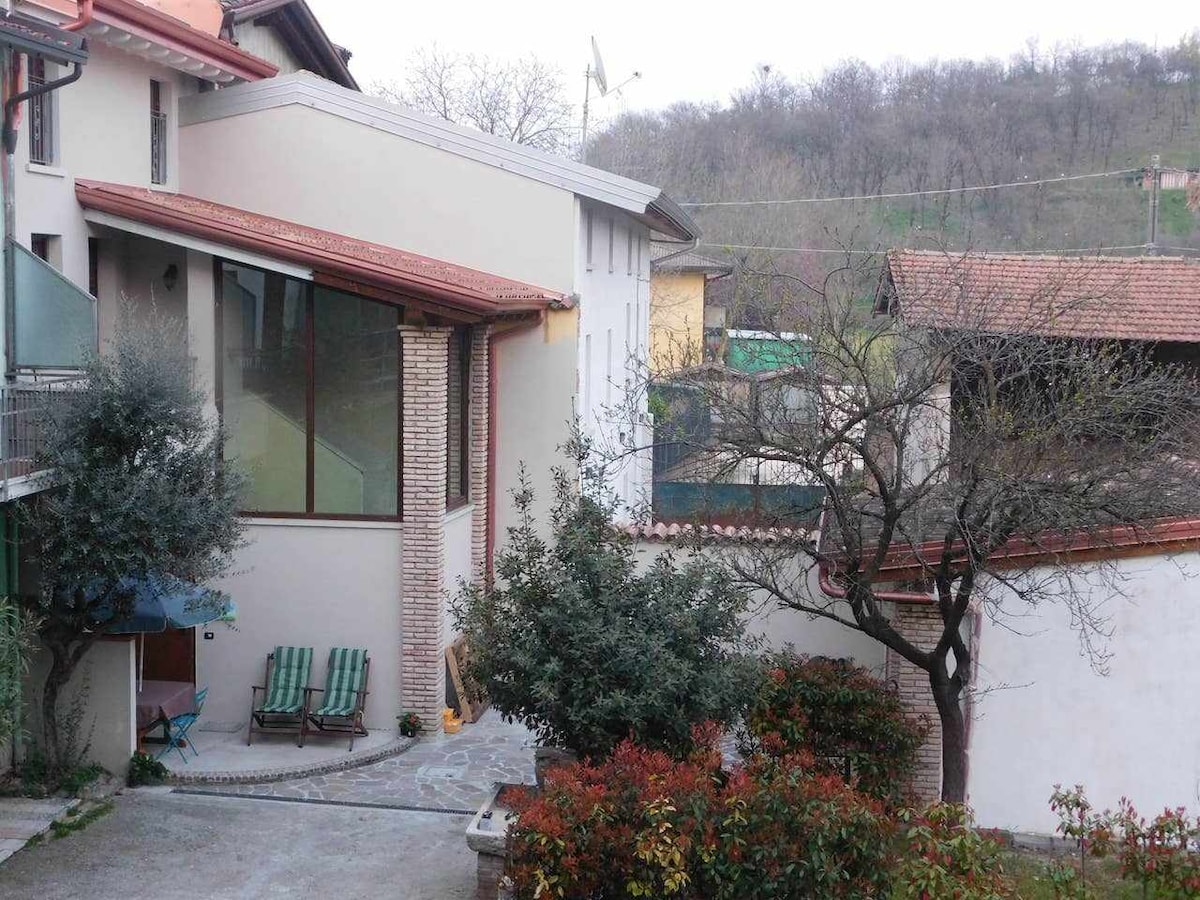 Ciao Sit back and relax - in this quiet, stylish accommodation right next to the forest. Beautiful old renovated rustico from 1900 with large open-plan living room/bedroom with balcony and large covered terrace with outdoor kitchen and lounge sofa. Large garden with mature trees.